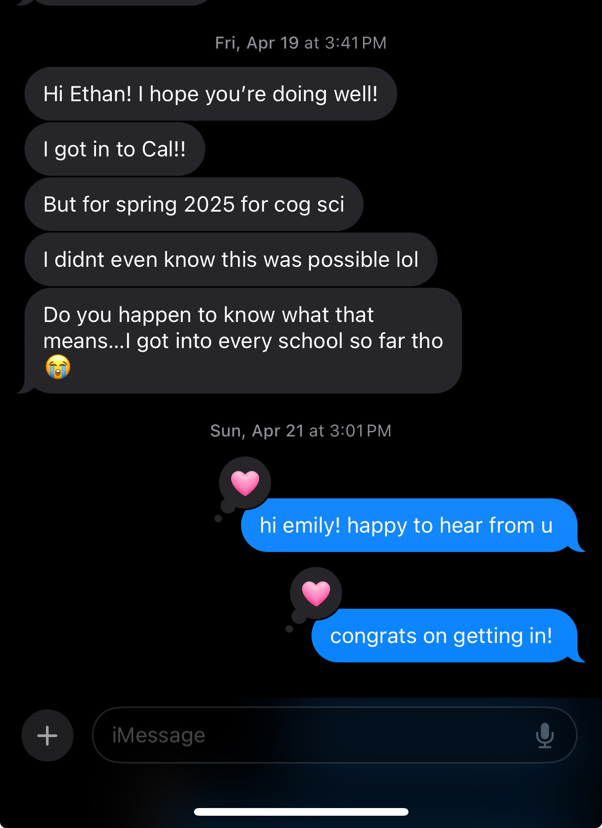 Ethan played a key role in my transfer journey. As a first-generation college student, I was unfamiliar with navigating my education. When I doubted my chances of getting into UC Berkeley and felt like I wasn't a strong candidate, Ethan encouraged me to stay positive. His support helped me manage feelings of imposter syndrome after transferring.
