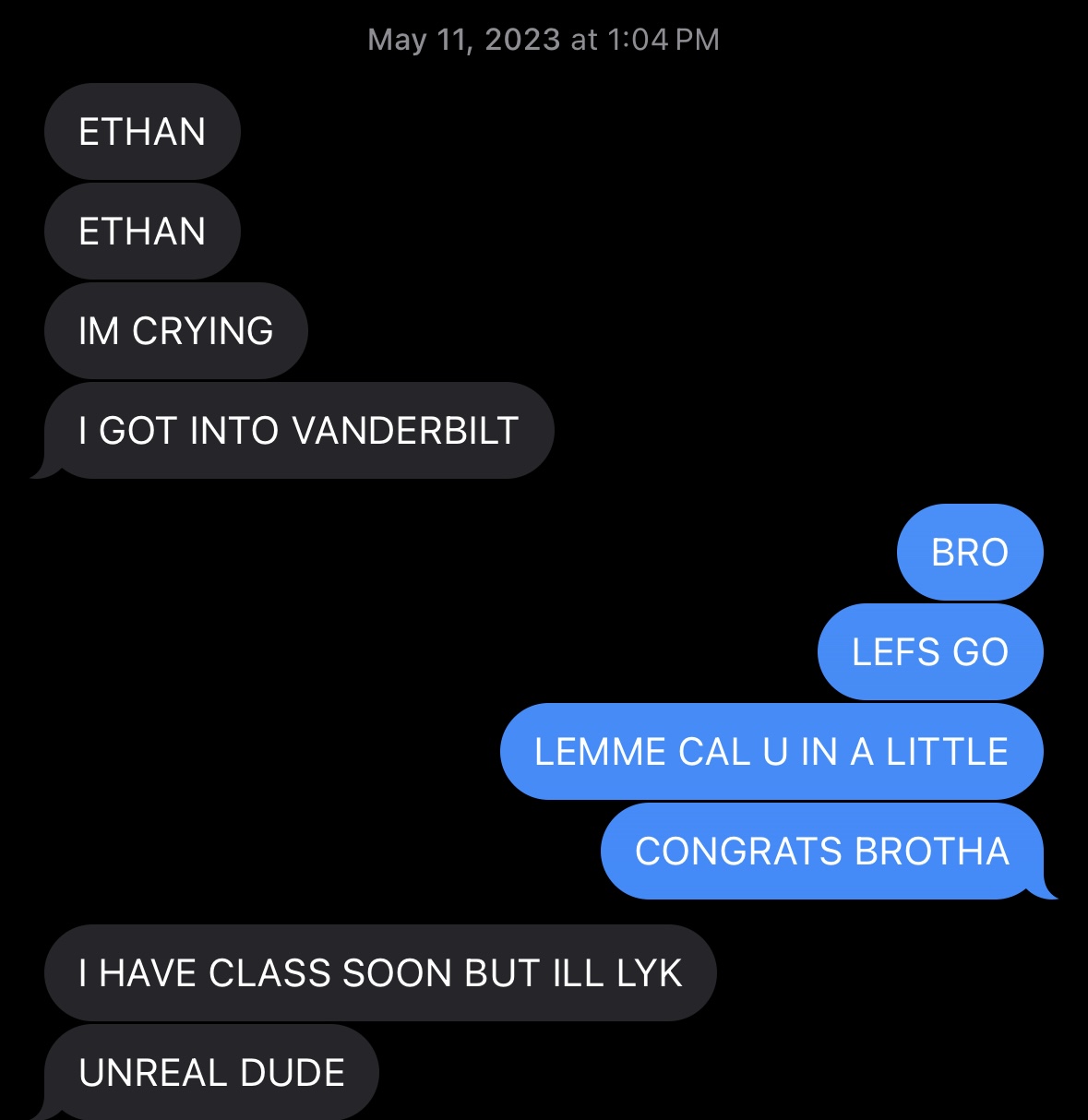 See the ResultsEthan is extremely knowledgeable about the college admissions process. He helped me get into the University of Connecticut, Johns Hopkins, and Duke. His guidance was clear, effective, and invaluable. I highly recommend him to anyone looking for college application support.